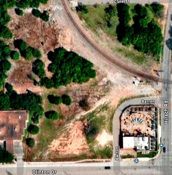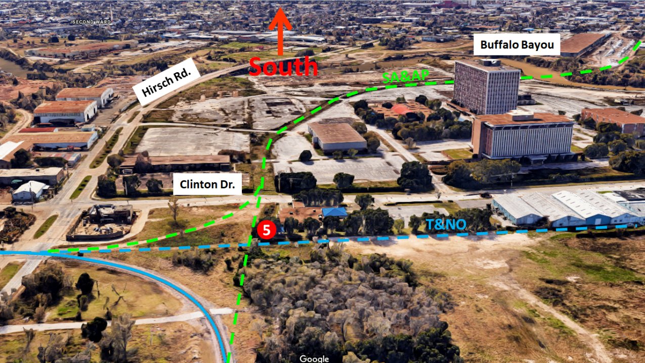 This simulated Google Maps 3-D view looks south toward Buffalo Bayou. The only surviving track at