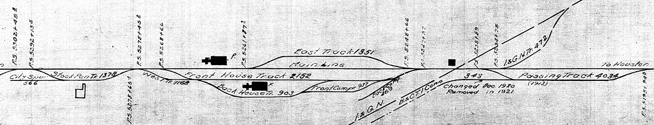 an "I&GN Tr." (transfer) track south of the diamond. The H&TC had been in Bryan