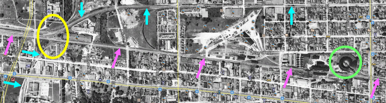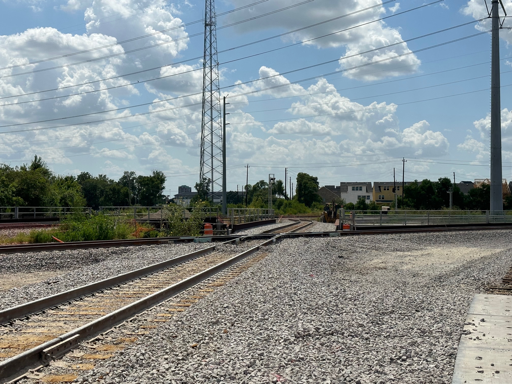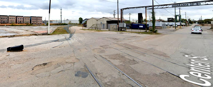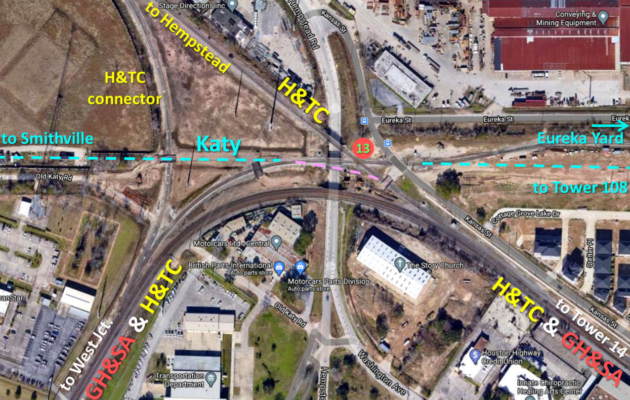 Hempstead Rd. marks the connecting track (pink dashes) between the Katy main and