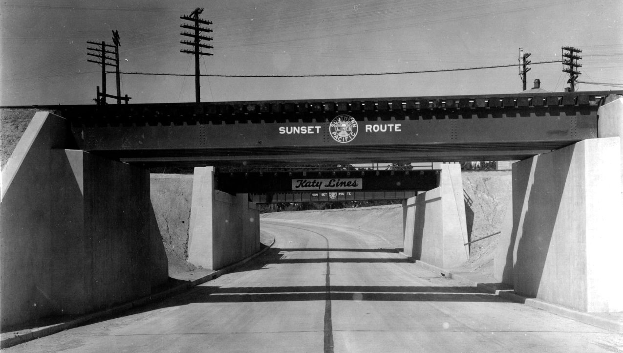SP's Freight Line (on the bridge) crossed over the Katy main line (now a paved