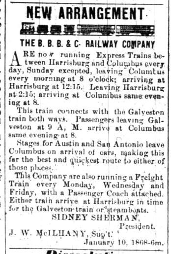 Harrisburg and Columbus. Note that "Stages for Austin and San Antonio leave