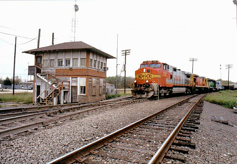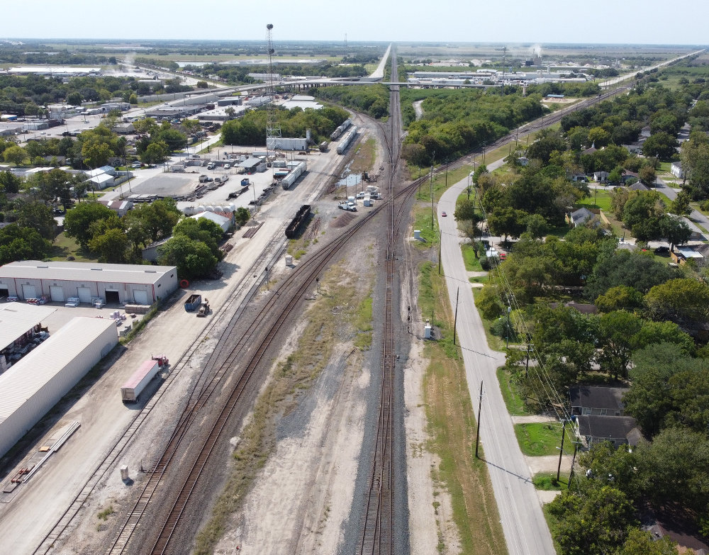 sitting on the former tower site to the left of the diamond. The BNSF main line from Galveston enters the image at lower left and crosses the