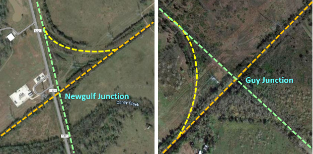made only as the exigencies of the service require." Below: The tracks are gone, but the junctions at Newgulf and Guy can be discerned from the tree lines. Neither was interlocked. ![]() |