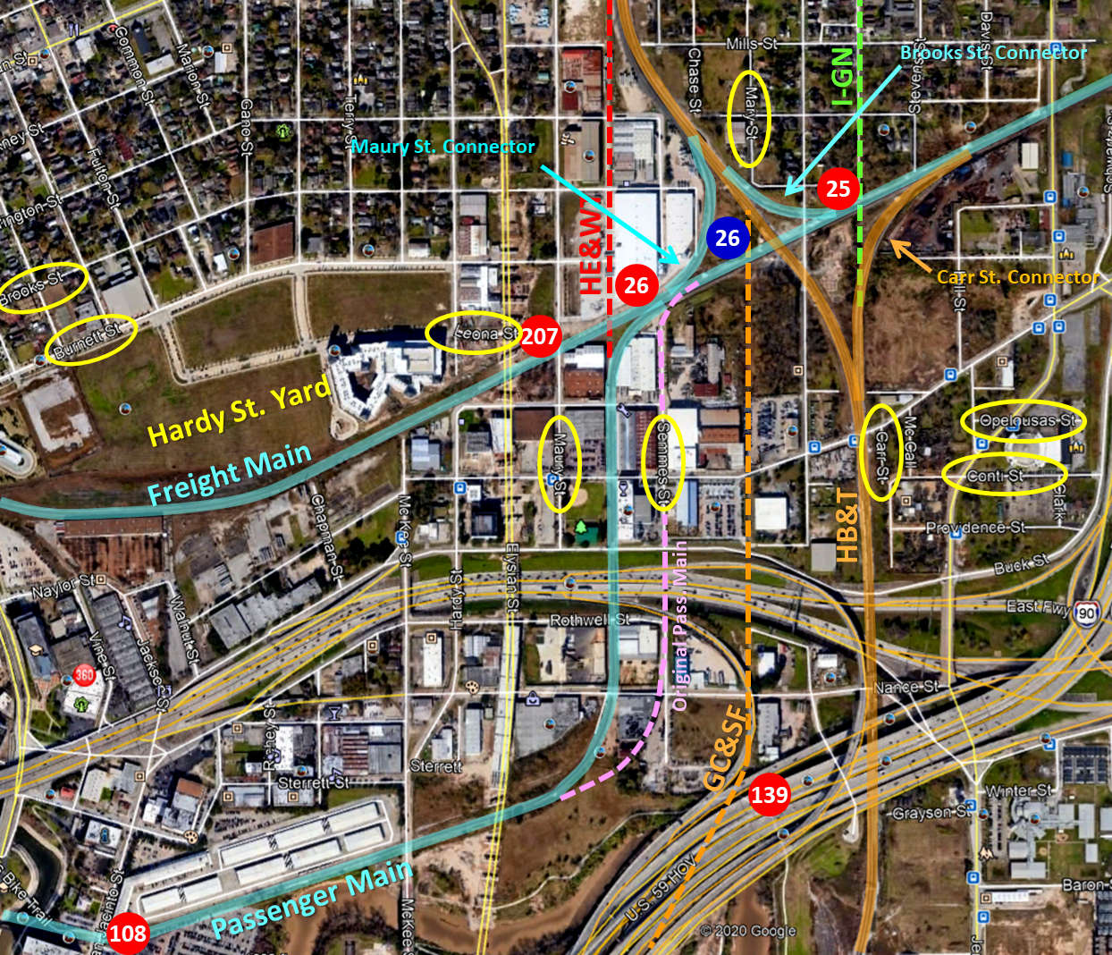 the tracks pass beneath the US 59 freeway. At lower left, the Brooks Street