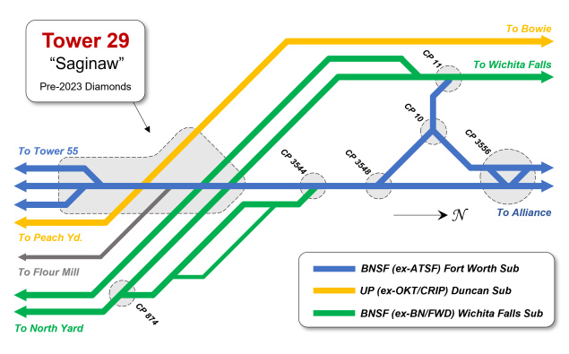 This track chart (with North to the right) illustrates the traditional track topology at Tower 29