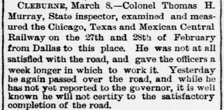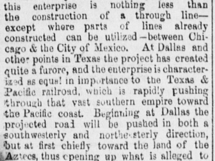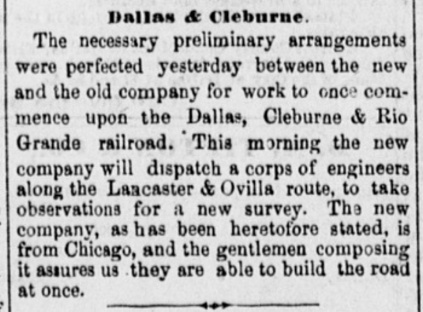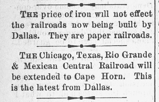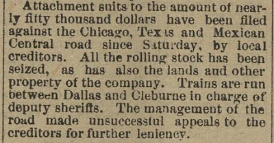 Texas Trunk and the Dallas, Cleburne & Rio Grande roads." The story also