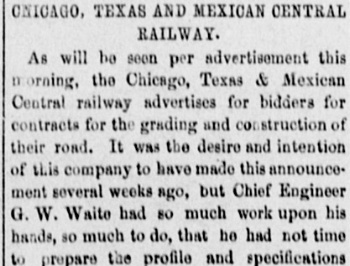 September, 1880 under a new name, the Chicago, Texas & Mexican Central (CT&MC).
