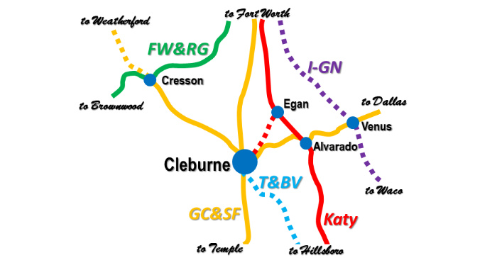 depots were located relative to the tracks entering Cleburne. The T&BV and Santa