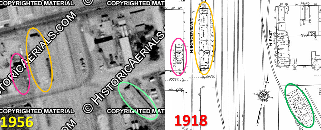 ((c)historicaerials.com) and a Sanborn Fire Insurance map from 1918 correlate