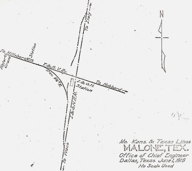 The T&BV line through Malone was part of a route originally constructed between Cleburne and Mexia. It never reached its original target, Beaumont, because it was taken over by B. F. Yoakum in 1905 and redirected to become a lengthy north/south route through Teague connecting Yoakum's railroads in Houston with those in north Texas via Waxahachie and trackage rights into Dallas. Eventually, as Yoakum's rail enterprise failed financially and splintered into its separate components, the T&BV remained operational during its lengthy receivership that began in 1914. When it ended in 1930, a new railroad, the Burlington - Rock Island Railroad, was established to take over the T&BV's assets. By this time, the growth of the rail network in Texas had rendered the line between Cleburne and Mexia unnecessary. The T&BV rails through Malone were abandoned in 1935 and Tower 45 was decommissioned at that time. For the entire route between Cleburne and Mexia, Texas Highway 171 was built and sits parallel to or directly atop the T&BV grade in many places. The I-GN line through Malone had a much longer life as part of the Missouri Pacific's line from Waco to Ft. Worth and was not abandoned until 1967. Remnants of the I-GN, particularly concrete bridges, are easily spotted from Farm Road 308 north and south of Malone.