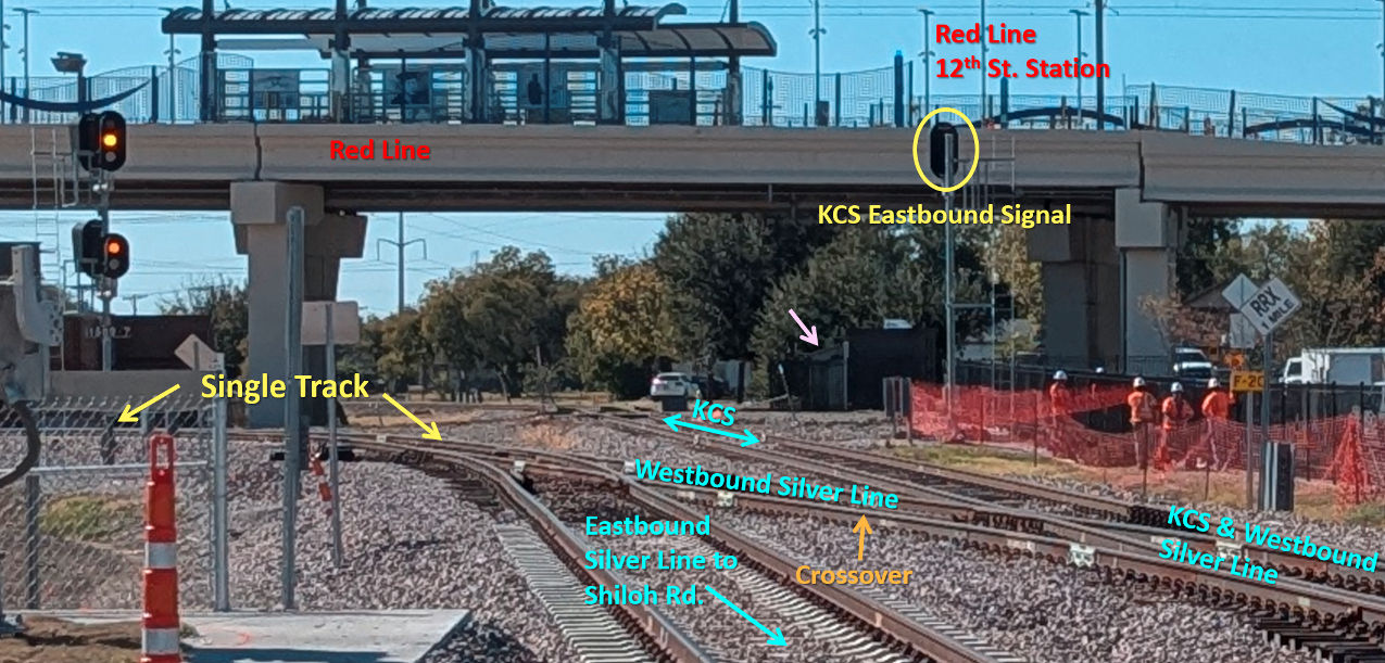 At 12th St., new DART stations were built for both the Silver Line and the Red Line (which did not previously have a station there.) The Red Line station is elevated on DART's bridge over the KCS tracks (sitting directly above the Tower 49 crossing site.) The Silver Line station sits at ground level about a tenth of a mile to the east, necessitated by the real estate needed for the station and parking lot. Just east of the elevated Red Line tracks at 12th St. Station, the Silver Line transitions from double track to a single-track segment, curving south as it passes beneath the Red Line bridge to occupy a narrow space parallel to (and west of) the Red Line almost all the way to City Line Station. The Silver Line reverts back to double track with a switch beneath the Hwy 190 tollway about a hundred yards north of City Line Station. There, the unswitched route carries Silver Line eastbound (northward) trains accelerating out of City Line Station. The switched route is for Silver Line westbound (southward) trains slowing for the stop at City Line Station. The total length of the Silver Line's single-track segment is approximately three quarters of a mile. At City Line, DART's existing Red Line station was expanded to make room for the Silver Line tracks and its passengers. At the south end of City Line Station, the Silver Line double track curves west to proceed a mile to the junction point with the KCS track to resume the Cotton Belt alignment to White Rock Junction.