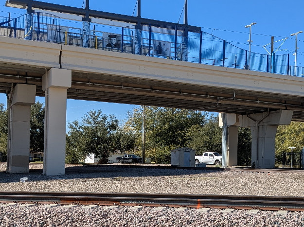 beyond the car crossing the tracks on the eastbound service road of the 190 Tollway. (all