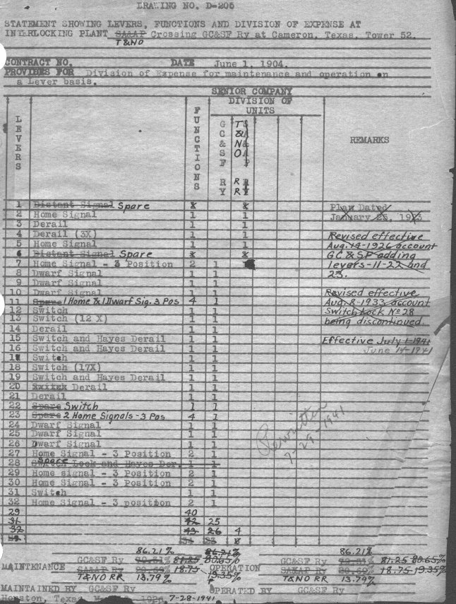 direct rates (for labor) and overhead rates (for materials.) The document shows that a new plan dated January 25, 1923 was implemented but the effective date is not specified. A revision was made on August 14, 1926 to account for Santa Fe adding functions to previously "Spare" levers 11, 22 and 23. Another revision occurred on August 8, 1933 when lever 28 was deactivated and returned to "Spare" status. It had previously controlled a "Switch Lock and Hayes Der." (derail) for Santa Fe. The interlocker was restructured effective June 14, 1941. The changes were sufficiently complex that the decision was made to create a new, 2-page document (on July 29, 1941) rather than attempt to mark up the original any further. After the 1941 changes, there were no modifications until May 1, 1951 when Santa Fe installed "light type signals" (presumably replacing semaphore signals.) Planning for this change, yet another version of this document was generated on April 11, 1951. The last documented change to the Tower 52 interlocker became effective on November 1, 1958 (below, Carl Codney collection) when "Semi-automatic operation" was established and the cost sharing became 50/50. ![]() |