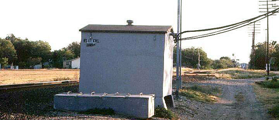 trackside concrete equipment cabinet is labeled "West End, Polk's".