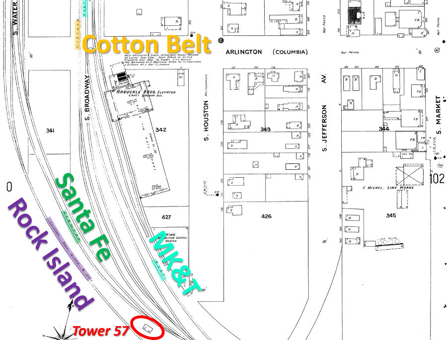 and Broadway and Water streets no longer exist. The following railroads have been highlighted on the map as their labels are illegible at this resolution: The Cotton Belt entered downtown from the north to reach the DTR&UD passenger station built in 1903. This was a branch that came off their line at Addison between Commerce and Ft. Worth. Santa Fe tracks from the south ran adjacent to the tower and terminated in downtown. This was a short branch off their line between Cleburne and Paris. Tracks of the Missouri, Kansas & Texas (MK&T, "Katy") passed near the tower and continued south to Hillsboro and north to Denton. At Denton, they intersected a shared line of the Katy and the Texas & Pacific (T&P) that ran between Whitesboro and Ft. Worth. The T&P also had east/west tracks through downtown Dallas several blocks north of Tower 57. The Rock Island tracks are visible on the berm in the photos above. They continued north along Water St. and then turned west to cross the Trinity and proceed to Ft. Worth. They also went southeast to a junction with Southern Pacific (SP) south of downtown. |