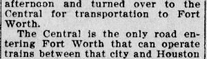 ![]() ![]() Note that 'Central' meant "Houston & Texas Central" (H&TC), a SP subsidiary. All snippets are from the Waxahachie Daily Light of Wednesday, May 27, 1908. |