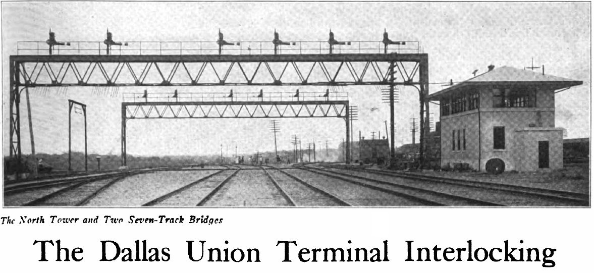 By the time the Railroad Commission of Texas (RCT) began regulating grade crossings among railroads in 1902, Dallas was already a major city served by multiple steam railways and an electric interurban. In the decades after the first railroad entered Dallas in 1872, a mass of tracks had descended upon the central business district, converging near the east bank of the Trinity River at the west end of downtown. The Tower 57 interlocker was commissioned by RCT on November 5, 1904 to manage the junction. The interlocking plant was an electrical design with 50 functions spread over 41 levers. The Gulf, Colorado & Santa Fe Railway, a Texas-based subsidiary of the vast Atchison, Topeka & Santa Fe Railway, was given official responsibility for managing the design and construction of Tower 57, which ended up closely resembling Tower 19, another Santa Fe-designed tower less than two miles to the southeast. Santa Fe shared the capital and recurring expenses for Tower 57 with four other railroads: the Missouri, Kansas & Texas, the Rock Island, the Dallas Terminal Railway and Union Depot (DTR&UD) Co., and the Northern Texas Traction Co., an electric interurban. The DTR&UD was owned by the St. Louis Southwestern ("Cotton Belt") Railroad, which had acquired it in 1901 for the purpose of building a downtown passenger station. This was the first attempt to establish a "Union Depot" for Dallas, but no other railroads joined this effort. For the twelve months ending June 30, 1906, RCT reported an average of 412 movements through the Tower 57 interlocking each day, comprised of 44 "train movements" and 368 "switching movements." It was a busy place!