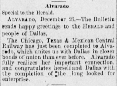 August 7th (below left.) Right: In contrast to the MP news, the Fort Worth Daily Democrat of April 19, 1881 had snide commentary on a recent editorial by the Alvarado Bulletin anticipating the construction of the CT&MC. This was par for the course; any railroad associated with Dallas was guaranteed to get bad press in Fort Worth. The "Byrd" reference pertains to the recent prior owner of the Bulletin, A. J. Byrd. But the CT&MC succeeded, and the Dallas Daily Herald of December 27, 1881 (below right) reprinted the Bulletin's greetings to Dallas that celebrated its arrival.