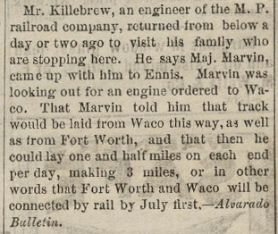 there on the Houston & Texas Central (H&TC) Railroad. Left: Fort Worth Daily Democrat, June 7, 1881, reprinting a news item from the Alvarado Bulletin reporting MP's plan to also build northward from Waco. Ennis was a major base for the H&TC. Right: Fort Worth Daily Democrat, August 2, 1881, reporting that the track-laying north from Waco had reached to within one and half miles of Alvarado. |