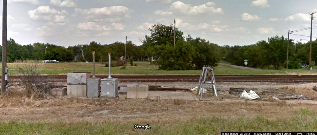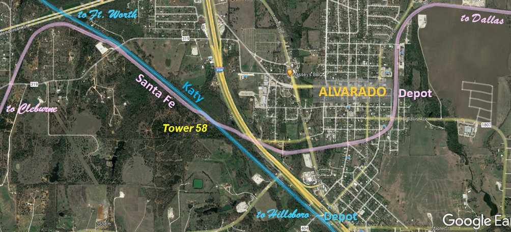 the tower, the Santa Fe curves back to the northwest beside the Katy. Note the exchange