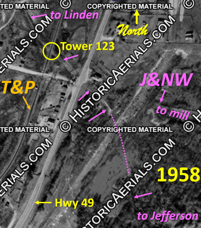 Transportation Archive) Below: This 1958 image ((c)historicaerials.com) shows the J&NW right-of-way sixteen years after the tracks were abandoned. The Tower 123 crossing was located at 32 46 22N, 94 20 23W, but satellite imagery shows no evidence of it today. The location of the cabin relative to the diamond is unknown. ![]() |