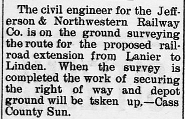 Left: The J&NW's construction north out of Jefferson had gone through Lanier,