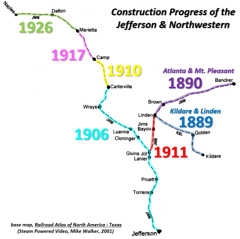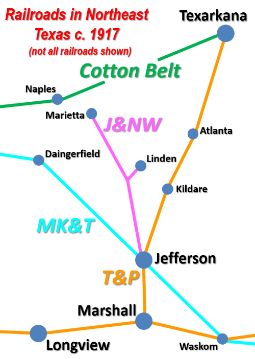 they continued to haul logs to their respective mills at Kildare and Bancker. RCT records list 1912 as the year the J&NW built 31 miles of track from Jefferson to Camp, but that was merely an initial "catch up" report. In F. I. Clark's testimony before the ICC in January, 1911, he stated that the J&NW had "...32 miles of main line and about 3 miles of spur track." The main track to Camp accounts for 31 miles. The 5-mile branch to Linden opened in November, 1911. Also, the Texas Forestry Museum Tram Database notes that an article in American Lumberman in 1906 stated that the J&NW had 25 miles of track. That would place the end of the line at Carterville. For construction through 1906, the Texas Transportation Archive lists J&NW track mileage increments of 12 (1901), 6.5 (1902), 4 (1903), -4.5 (1904) and 7 (1906.) In his testimony to the ICC, Clark explained to Examiner Burchmore that it would take "four or five years" to finish cutting the currently accessible timber, after which the mill at Jefferson would be closed. Burchmore: "What about the railroads?" Clark: "The railroads will continue to operate. I will say that we are constructing and building road right along. We are now -- the end of the road is now within about twelve miles of the Cotton Belt. We are down in that neighborhood and we are working as fast as we can today to get that line up." Burchmore: "Do you run through any more timber?" Clark: "No, there is no more timber." Burchmore: "What is the purpose of making that connection?" Clark: "Simply to have a railroad." Burchmore: "Might it be suggested that you are building across to the Cotton Belt in order to sell the line you have now, to save it?" Clark: "That is our idea exactly. We have considered it a valuable property and expect to get more than it has cost us out of it in some way, either by the sale of the property or by the operation of the road." The Cotton Belt connection was at Naples but the J&NW would not reach it until 1926, with an intermediate termination at Marietta in 1917. |