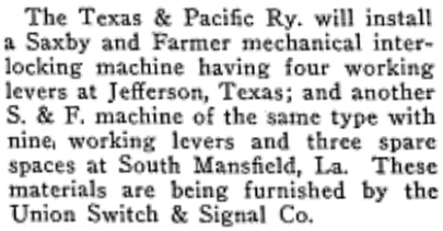 Left: (Railway & Engineering Review, May 23, 1925) In the spring of 1925, the T&P ordered a four-lever mechanical interlocking plant to be installed at the J&NW crossing at Jefferson. On October 13, 1925, Tower 123 was commissioned by RCT as an 8-function mechanical cabin interlocker. A file in the RCT archives at DeGolyer Library, Southern Methodist University states that the interlocker was "4,770 ft. north of T&P passenger station at Jefferson". The interlocker was inspected by RCT on February 1, 1926 and was described as "normal clear for T&P" and "operated entirely by train service or other employee of J&NW". The crossing had existed since the initial tram line construction c.1891 and had been uncontrolled since then, although a gate may have been installed. In the January 2, 1943 edition of Railway Age, Tower 123 appears in a table labeled "Manual control using miniature levers or push buttons with no mechanical locking but with circuit interlocking" for 1942. This might have been a conversion to pushbutton controls in a locked compartment on a post mounted outside the cabin so that the cabin was no longer necessary. This approach became the predominant control arrangement for cabin interlockers in Texas, and is still in use at Tower 103. |