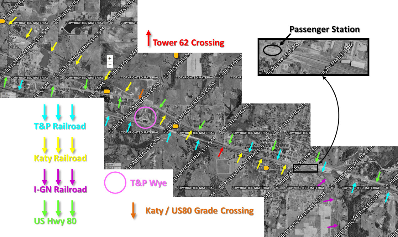 The Texas & Pacific (T&P) Railway began as a federally chartered railroad authorized to build from Marshall, Texas to San Diego, California. The charter was granted in 1871, and the following year, the T&P acquired 25 miles of track between Longview and Marshall when it purchased the Southern Pacific Railroad, a Texas company unrelated to the famous railroad of that name. Westward construction proceeded in 1873 with the T&P completing 126 miles of track from Longview to Dallas. This segment included construction through the community of Sodom. By the time the T&P arrived there, it had been renamed Mineola, reportedly for a railroad executive's daughter Ola and her friend Minnie (and Mineola sounded better than Olaminnie.) The rail executive was with the Houston & Great Northern (H&GN) Railway which had just completed a 44-mile branch from their main line at Troup through Tyler to Mineola. Supposedly, the H&GN got the town's naming rights because they reached Sodom fifteen minutes ahead of the T&P! The H&GN merged with the International Railway later in 1873 to form the International and Great Northern (I-GN) Railway. As the I-GN had no plans to build beyond Mineola, their tracks remained south of the T&P. Thus, when the Missouri - Kansas - Texas (MKT) Railroad (more commonly known as "the Katy") built 51 miles from Greenville to Mineola in 1881, they had to build across the T&P to have a connection with the I-GN. This crossing was interlocked as Tower 62 on December 12, 1905 with a 12-function mechanical plant. By June 30, 1906, Tower 62 was averaging 25 movements per day through the interlocker according to the 1907 Annual Report of the Railroad Commission of Texas (RCT).