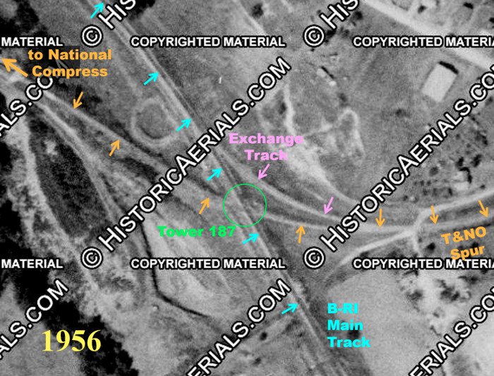 Left: This 1956 aerial image ((c) HistoricAerials.com) has been annotated to show the track topology at Tower 187 (green circle) where the B-RI main line (blue arrows) and an adjacent siding crossed the T&NO spur (orange arrows) to the National Compress facility. The siding was B-RI's endpoint for a T&NO / B-RI exchange track (pink arrows) that came off the T&NO spur. The siding was parallel to the B-RI main line and extended far enough south to cross the T&NO spur at Tower 187. As explained in the T&NO ETT (above), "B-RI siding, which crosses the T&NO compress tracks at this location, is not protected by interlocking." This meant that the Tower 187 interlocking only controlled signals on the B-RI main line for its crossing of the T&NO spur. There were no signals, interlocked or otherwise, that governed movements on the B-RI siding over the T&NO spur. |