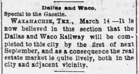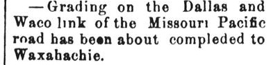 Waxahachie. Construction was completed in 1879 and the railroad's name was
