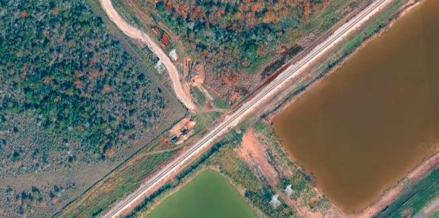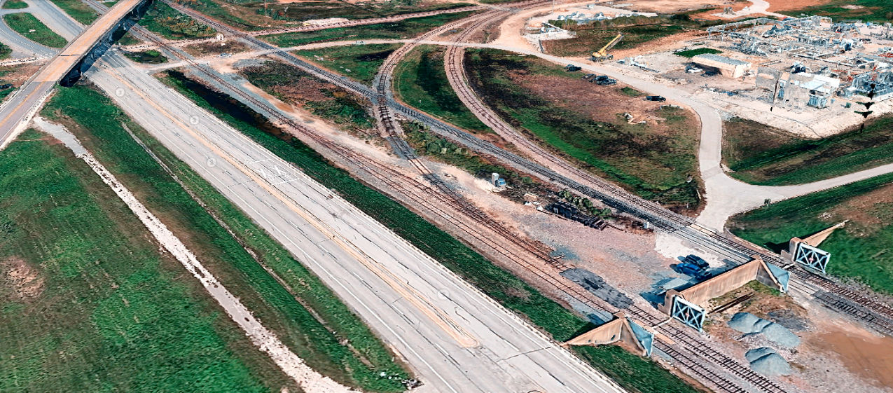into the foreground and encircles several railroad ties beneath the TCT tracks,