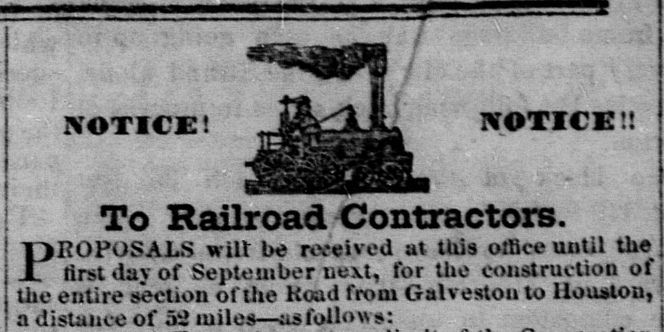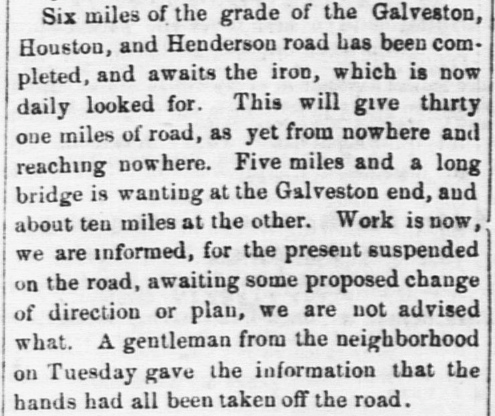 1853. Left: GH&H ad soliciting contractor proposals (Galveston Journal, July 15, 1853) Right: Things did not go smoothly for the GH&H. More than three years in, it was a railroad "from nowhere and reaching nowhere" with 25 miles of track completed, still lacking a bridge onto Galveston Island. (Houston Weekly Telegraph, July 22, 1857) |