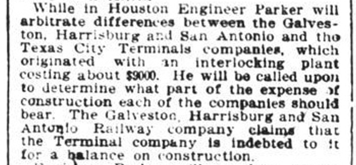 was no need for TCT signals between the diamonds. Right: The Houston Post of September 23, 1910 noted that RCT engineer R. D. Parker was in Houston for various purposes including to arbitrate a dispute between the GH&SA and the TCT regarding the capital expense of the Tower 73 interlocking plant. The diamond existed prior to 1901 hence RCT rules required all three railroads to share the capital expense for the tower equally. SP had the most experience in building and operating interlocking towers so it took the project lead. RCT documentation confirms that the GH&SA was also given operational responsibility. Recurring operations and maintenance costs were shared by the ratio of each railroad's allocated interlocking functions to the total function count for the plant. |