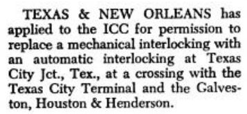 tower building is undetermined. Left: The November, 1958 edition of Railway Signaling and Communications carried this item regarding T&NO's application to the Interstate Commerce Commission (ICC) for permission to replace Tower 73 with an automatic interlocking. The Federal Transportation Act of 1920 had expanded the ICC's jurisdiction to regulate railroad operations nationwide, and by the mid 1930s, it had effectively displaced RCT as the agency managing interlocking plants in Texas. RCT nominally continued its traditional role, but with no ability to override ICC decisions, RCT found the railroads eventually stopped soliciting its authority. RCT provided one final tower number assignment for Tower 215 c.1966 and then ceased to be involved with interlocking plants, concentrating its focus on regulating oil and gas production in Texas. |