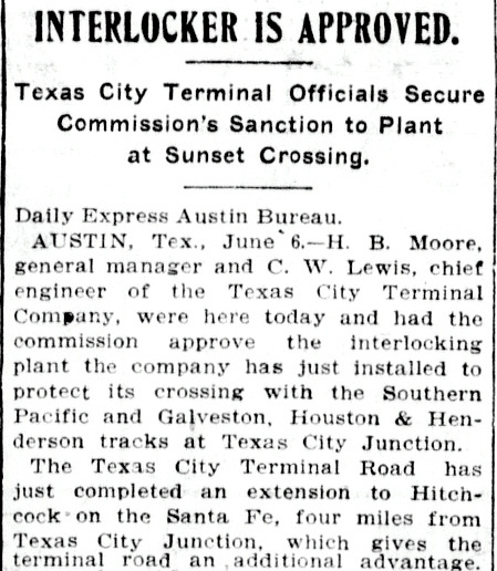 Galveston, Houston & Henderson (GH&H) Railway. His train has just crossed the tracks of the Texas City Terminal (TCT) Railway which