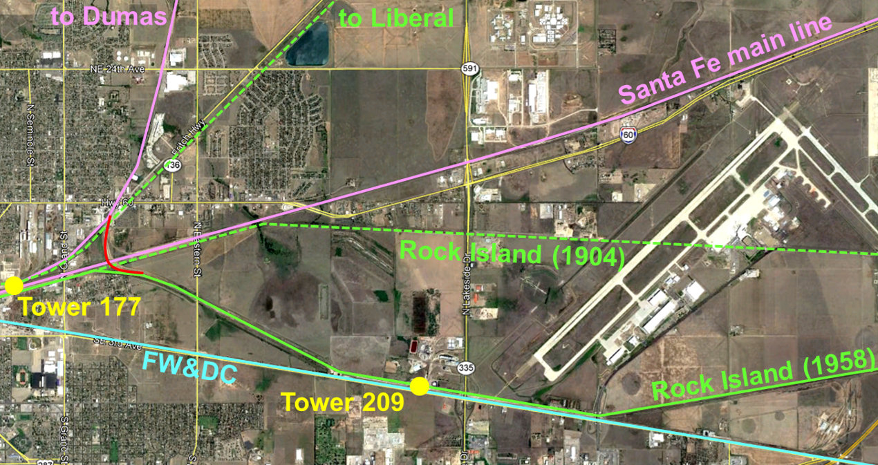 Left: These two copyrighted images are from historicaerials.com showing the re-location of the Choctaw Route caused by the expansion of Amarillo Air Force Base. The upper image from 1953 shows the Amarillo municipal airport with the Santa Fe main line along the north side of the air field. The Choctaw Route ran parallel to (and a quarter mile south of) the south boundary of the airport. The Amarillo Army Air Field immediately east of the airport was a training center that shared the airport's runways. Closed after the war, the base was reactivated in 1951 as Amarillo Air Force Base and given a mission of training jet mechanics. In 1955, the decision to host operational B-52s at the base meant that a much longer runway would be needed. This required Rock Island to relocate its Choctaw Route tracks farther south. The new runway extended almost all the way south to the FW&D right-of-way. The lower image, from 1967, shows the abandoned Choctaw Route right-of-way through the base (green dashed line), replaced by new tracks that included a two mile section parallel to the FW&D. West of the runway, the Choctaw Route angled slightly more northwest and re-joined the original tracks where they paralleled the Santa Fe main line (before crossing over at Tower 75.) The precise date of Rock Island's relocation project has not been determined, but their efforts to establish Tower 209, where the new track crossed a FW&D spur, occurred in September, 1958. Since Rock Island took responsibility for resolving the interlocking issue for this crossing, it is reasonable to assume that they were the "second railroad" that created the crossing. Hence, this spur most likely already existed and the crossing materialized when the relocation project built across the spur, probably in the summer of 1958. |