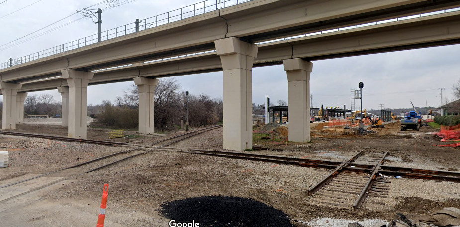 section of former Cotton Belt tracks beneath the overhead DART bridge. Farther