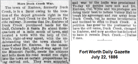 organizer, had held a very important part-time job: Postmaster for Duck Creek. Per the above report in the Galveston Daily News, MP had decided that "...the town will not be removed." Santa Fe tried to convince MP to forego naming their depot Duck Creek. Embree was only a quarter mile from MP's planned depot site, but MP stuck to an agreement they had made with Duck Creek (below, Fort Worth Daily Gazette, July 22, 1886.) The Duck Creekers were also convinced that relocating their businesses to the "new" Duck Creek would prevent their post office from being moved to Embree. ![]() |