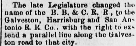 Left: The Houston Evening Telegram of September 9, 1870 reported that the "late Legislature" had changed the name of the BBB&C to become the "Galveston, Harrisburg & San Antonio R. R. Co.". The Legislature had acted earlier in the summer; the Handbook of Texas claims July 27 as the date. The article reports that the charter amendment included "the right to extend a parallel line along the Galveston road to that city." This authorized the GH&SA to lay tracks from Harrisburg to Galveston, essentially parallel to the existing Galveston, Houston & Henderson (GH&H) Railroad which had the only line between Houston and Galveston. Despite this authorization, the GH&SA never built its own line to Galveston, but eventually served it using an acquired line. |