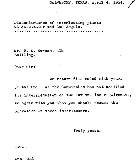 Tower 82 first appeared in RCT's annual list of inactive interlockers at the end of 1930. This was the final comprehensive list of active and inactive interlockers that RCT ever published. Since Santa Fe owned both rail lines, it made sense to seek RCT permission to decommission Tower 82 (which RCT apparently granted, given Tower 82's inclusion in the list of retired interlockers.) Based on the suspension referenced in the letter to Maxson, Santa Fe had presumably for several years held the belief that Tower 82 was not cost-effective for their operations through San Angelo. Apparently there would be few trains materially impacted by the need to come to a complete stop before crossing the diamond, whereas the cost of staffing and maintaining the interlocking tower would be significant. Given Tower 82's relatively early demise and its location on the north outskirts of San Angelo (far from town back in the 1920s), it is perhaps not surprising that no reports have surfaced regarding the dismantling and disposition of the tower.