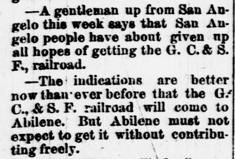 Abilene.![]() Left: The Taylor County News of November 27, 1885, quotes a Fort Worth Gazette report that the main line has terminated at Coleman, and that the "commissariat" was being redeployed. The location "where they are laying track" was a westward line that branched off the main track near Coleman. GC&SF historian William Osborn describes the charter amendment that was filed by the GC&SF early in the summer of 1885. ...there was debate within the company regarding the best destination for its westward terminus...[T]he charter was amended to provide for a change of route west of Temple, routing through the counties of Bell, Coryell, Lampasas, Brown, Coleman, Runnels, Taylor, Tom Green, Nolan and Mitchell, forming a junction there with the Texas & Pacific Railway. Jay Gould’s Texas & Pacific line between Fort Worth and El Paso had been completed in 1881... |