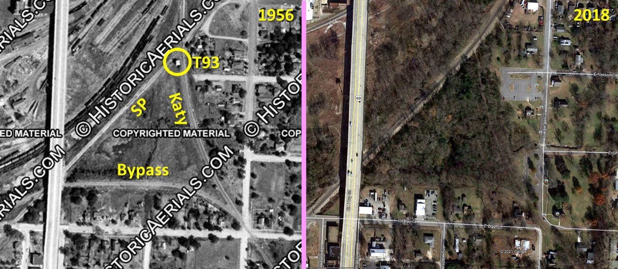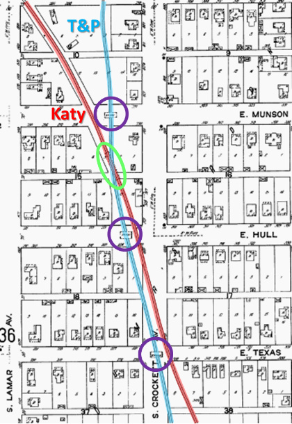 tracks is automatic. Right: In 2019, two "walk-in" cabinets still sat at McCune (named for W. H. McCune, Katy's "Road Foreman for Engines") in this Google Street View from near the Armstrong Ave. grade crossing. The west switch for the Lamar cutoff was located here, where Harry Brown described the challenge of crossing Armstrong Ave. fast enough to maintain speed on slick rails but slow enough to allow time for the brakemen to manage the crossover switches. |