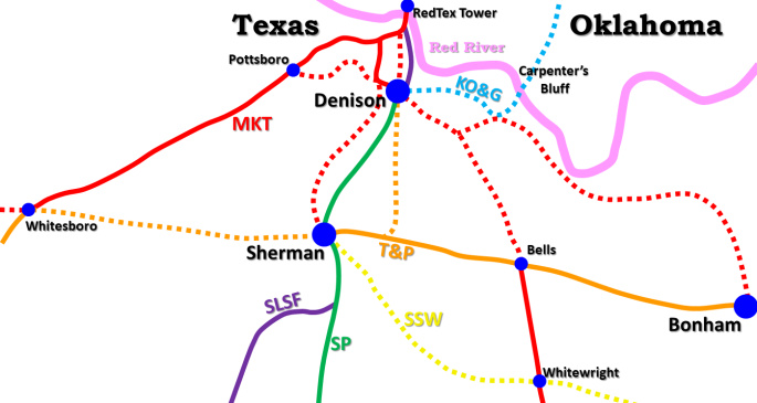 railroads in Texas that did not own tracks into Sherman or Denison were Santa