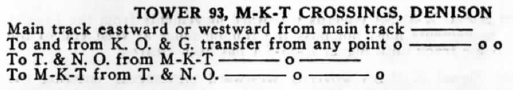 The relatively high number of functions implemented by the Tower 93 interlocker is indicative of the track complexity nearby. Though it is not obvious in the 1956 aerial image above, there was a connecting track immediately west of the tower that allowed SP passenger trains to access the Katy tracks north of the tower to reach Union Station. The KO&G was never listed by RCT as having any involvement with Tower 93, but this may have changed after 1930; by 1940, one of the whistle codes for Tower 93 operators requested movements to and from the KO&G transfer track.