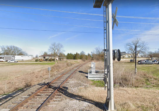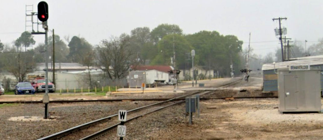 crossing in downtown Brenham, with Tower 95 sitting across the Santa Fe tracks