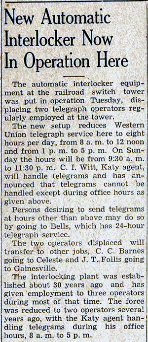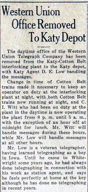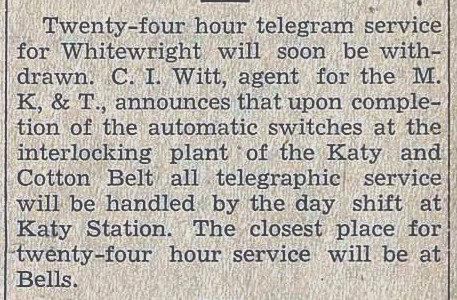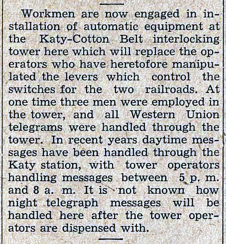 service provided by the railroads to the Whitewright community. Left: The Whitewright Sun newspaper of May 5, 1932 detailed that telegraph operations in the "interlocking plant" were becoming daytime only, 8 hours per day. The story mentions that months earlier, the service had been cut back from 24 hours to 16 hours. This appears to have resulted from a staffing reduction in the tower that was blamed on the Cotton Belt eliminating passenger service to Whitewright. The story implies that previously, there had been a late night Cotton Belt passenger train that had justified the need for 24/7 staffing in the tower. Right: A year later, the Whitewright Sun reported on July 13, 1933 that daytime telegraph operations were being moved from the tower to the Katy depot. Apparently, a change to the Cotton Belt's schedule resulted in the need for a tower operator overnight and eliminated the need to staff the tower during the day. The implication is that under the revised schedule, the Cotton Belt ran zero trains through Whitewright during the day, so it was acceptable to line the signals for unrestricted passage on the Katy and leave the tower unmanned. |