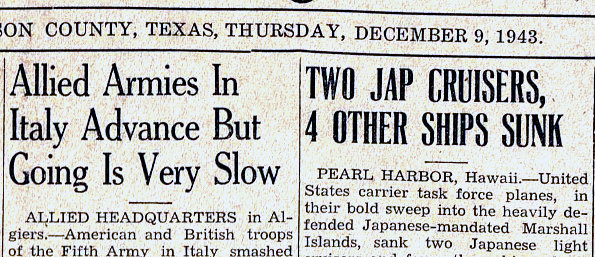 tower. Lower Left: On November 11, 1943 the Sun reported the upcoming impact to telegraph service in Whitewright due to the impending closure of the tower. The town of Bells (~ 8 miles away) was identified as the nearest location with 24-hour telegraph service, presumably at Tower 20. Right: On Thursday, December 9, 1943, the Sun gave the new automatic interlocker a small headline as it announced that the tower was no longer staffed. Significantly, the story identifies C. I. Witt as a Katy agent and states that two other operators are being transferred to Gainesville and Celeste respectively, both of which were locations with Katy interlockers. It is safe to assume that Tower 101 had been staffed exclusively by Katy employees which tends to confirm that the tower was built by the Katy. (Railroads shared tower expenses for maintenance and staffing, but in most cases, only one railroad supplied the tower personnel.) Although a separate equipment cabin could have been used, it seems likely that the new system was installed in the bottom floor of the tower and that the tower remained in place, though unmanned. If so, the tower was probably removed shortly after the Cotton Belt abandoned its tracks through Whitewright in late 1953. The major headlines (below) in the same issue of the Sun put the timing of the automatic interlocker upgrade into perspective. ![]() |