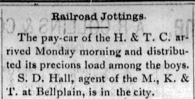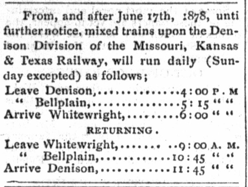 Left: Two months after the excursion train to Whitewright for the town lot auction, the Denison Daily News of June 17, 1878 published this schedule for service by the Katy from Denison to Bellplain (later named Bells) continuing to Whitewright and return. This was obviously on the D&S tracks yet it conveys the reality that within a couple of months of the first trains to Whitewright, the route was publicly operated by the Denison Division of the Katy. Right: The January 28, 1879 edition of the Denison Daily News reported that Katy's agent at Bellplain was visiting Denison. The existence of a Katy agent at Bellplain is further evidence that the Katy was operating the D&S under some arrangement. |