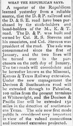 Left: The Denison Daily News of January 8, 1880 repeated a news item from another newspaper ("the Republican", location unknown) that a group of stock and bondholders of the Katy railroad had arranged the investment capital to buy both the D&S and the D&P. Supposedly the sale had been consummated during the first week of January and the lines would be combined into a new railroad, the Missouri, Kansas & Texas Railway Extension. This is an early reference to "Extension"; the railroad would ultimately become the Missouri, Kansas & Texas Extension Railway. Despite the apparent plans of the new management, the southeastern extension to Palestine only made it as far as Mineola. The southwestern extension, "150 miles" with no specified endpoint, ended up being northwest to Wichita Falls (and beyond into Oklahoma by acquisition.) Both extensions were executed by the Katy. Right: The Denison Daily News of April 15, 1880 reported that a contract had been let to John Scullin to extend the rail line from Whitewright to Greenville. The article references the railroad as the "Denison & Southeastern railroad, now owned and operated" by the Katy. The reporter may not have been aware that D&S had been re-chartered a month earlier as the Missouri, Kansas & Texas Extension Railway. The story conveys the reality on the ground that this was a Katy operation all the way, regardless of who owned the tracks and when the legal paperwork might catch up. It is interesting to note that the contractor, John Scullin, had been one of the founders of the D&P. |